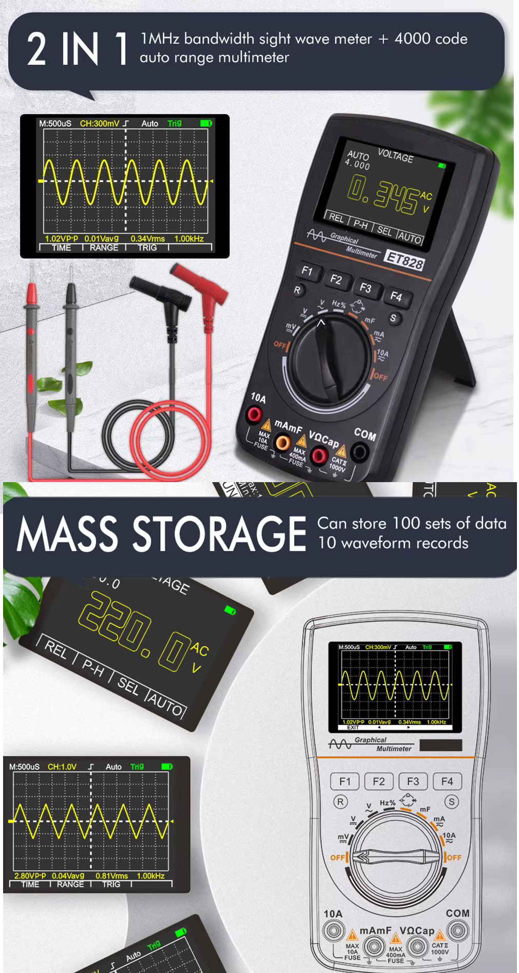 ET828 2 in 1 Oscilloscope Multimeter Digital 1MHz 2.5Msps Color Screen DC/AC Current Voltage Resistance Frequency Diode Test