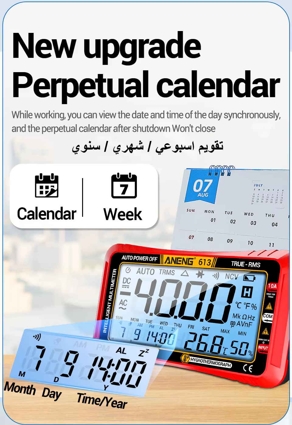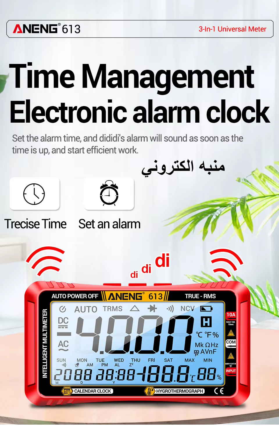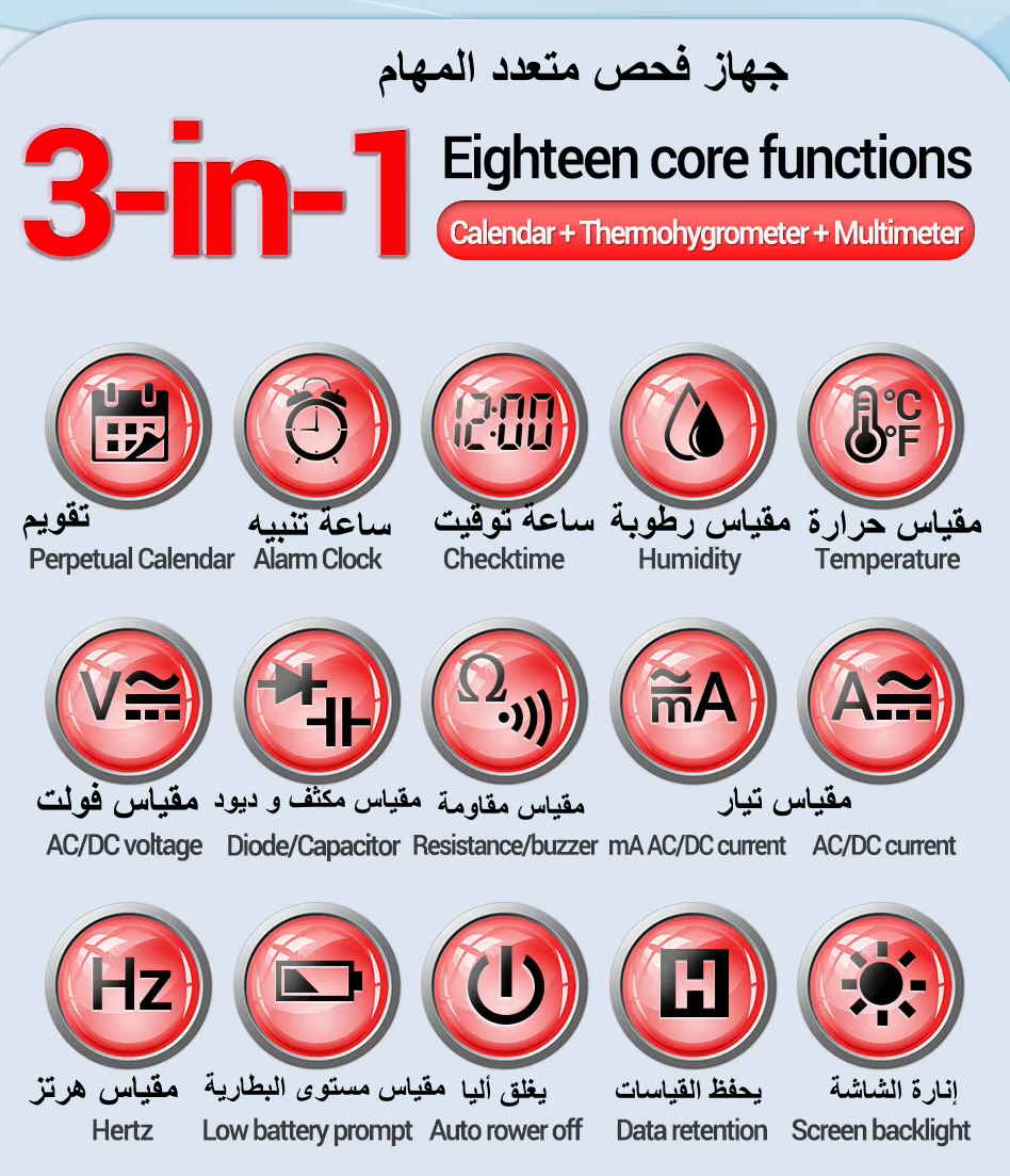+ ساعة توقيت وتقويم أيام + مقياس حرارة ورطوبة |