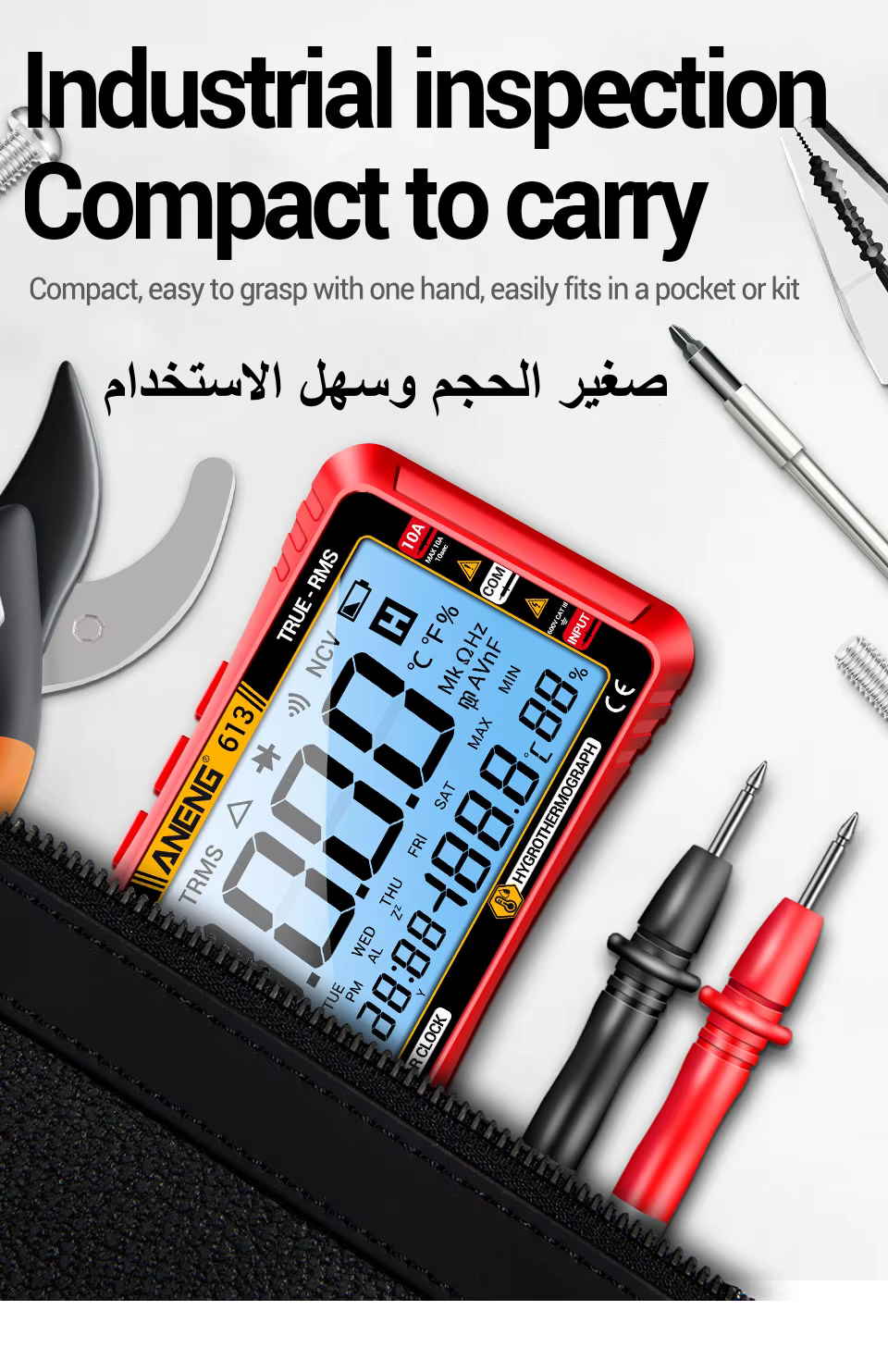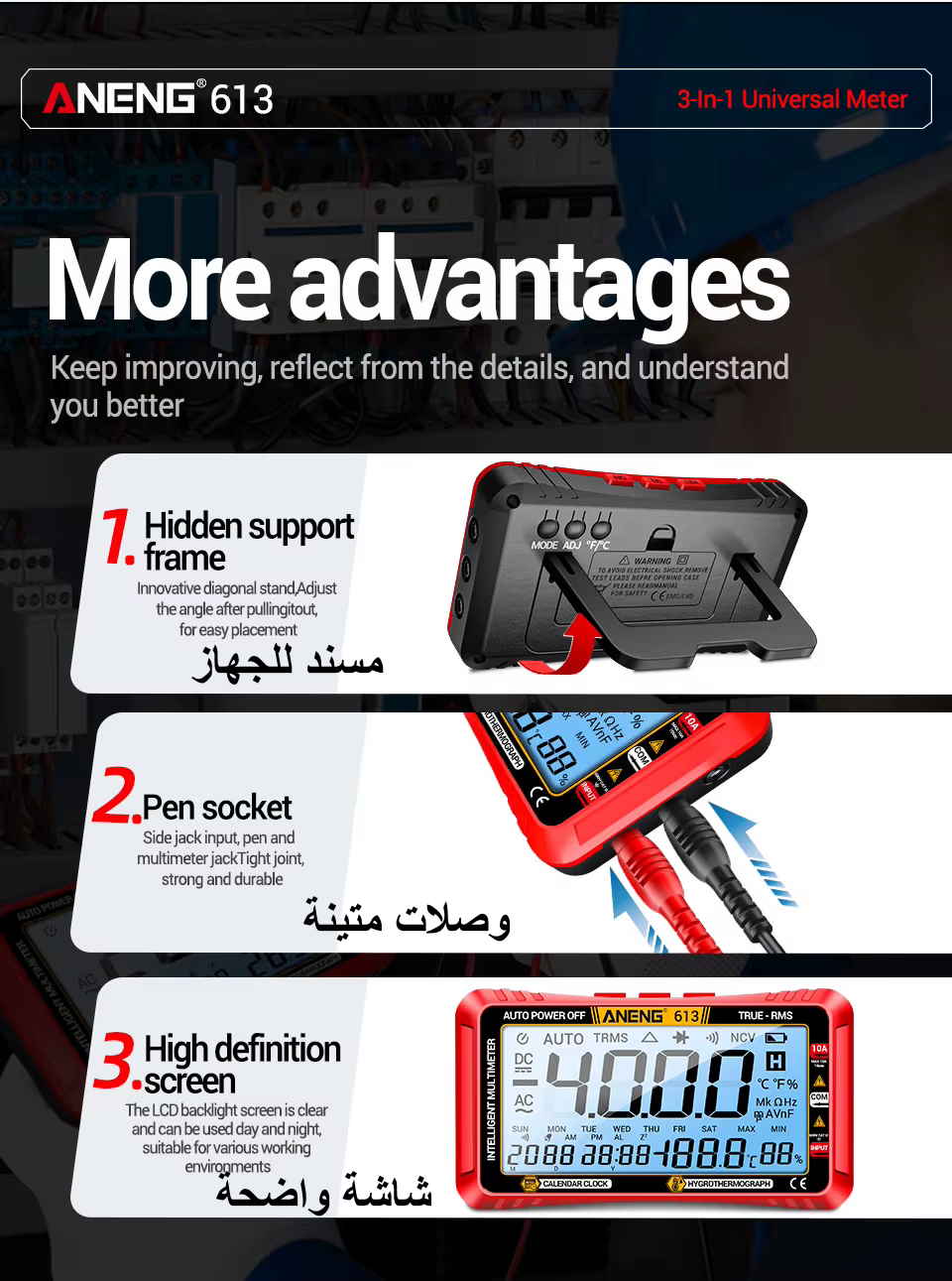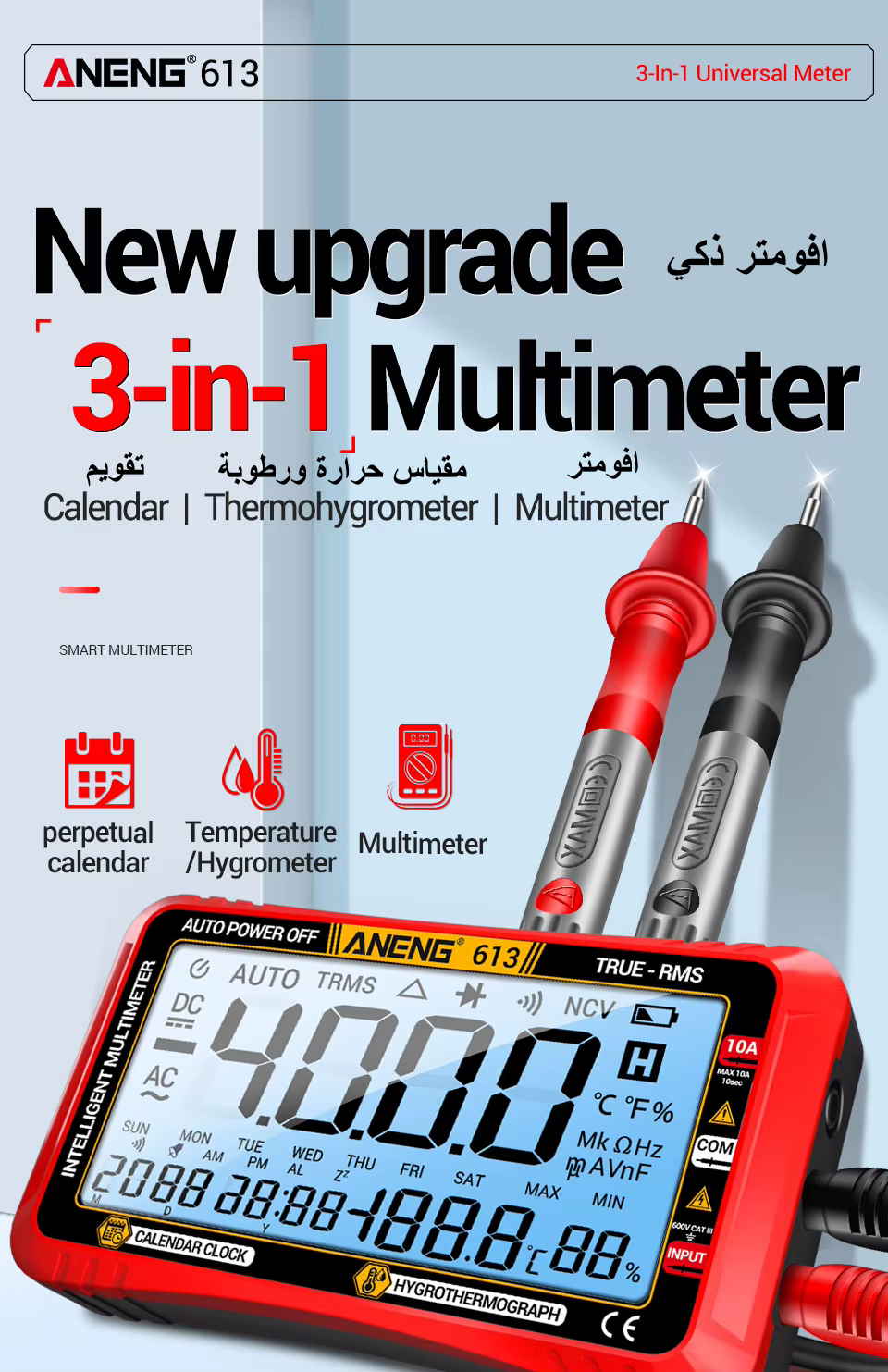 + ساعة توقيت وتقويم أيام + مقياس حرارة ورطوبة |