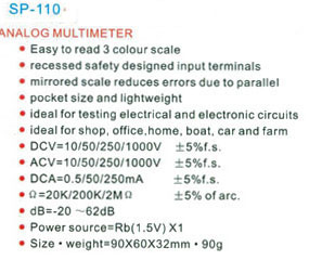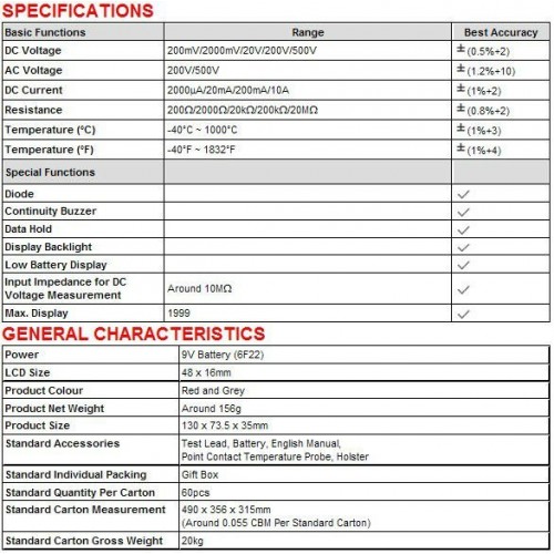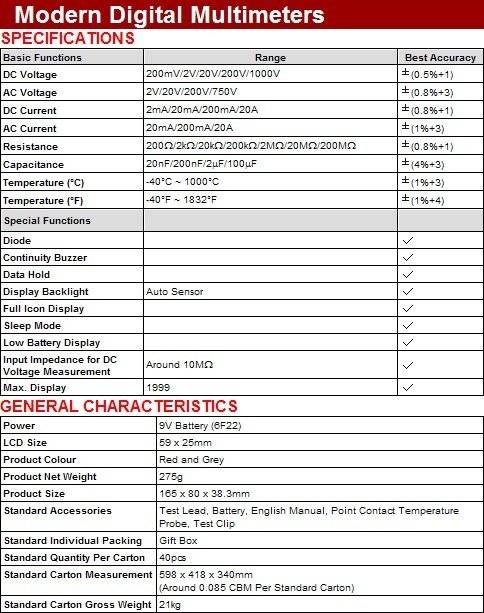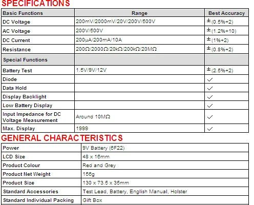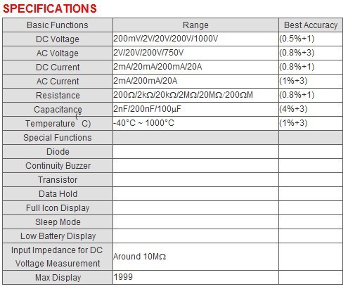 DC Voltage: 200mV-2V-20V-200V-1000V (±3%)