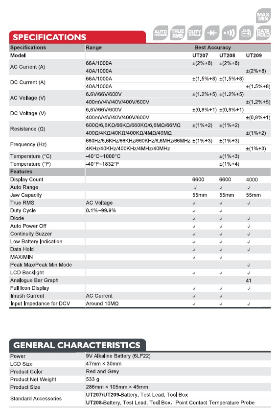 Auto Range; Jaw Capacity: 55mm True RMS; AC Voltage; Diode; Auto